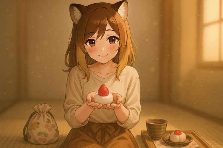 コモチが柔らかな私服姿で新しい器を両手にそっと見つめる。自然光が差し込む部屋で、腰のリボンと果物柄の巾着袋が心地よい暮らしの輪郭を描いている。 Komochi, in gentle casual wear, gazes quietly at a ceramic bowl she holds. Sunlight filters through the window, highlighting her waist ribbon and a fruit-patterned pouch in a peaceful living space.